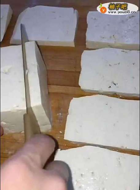 2用刀把豆腐切成长方形大块。
