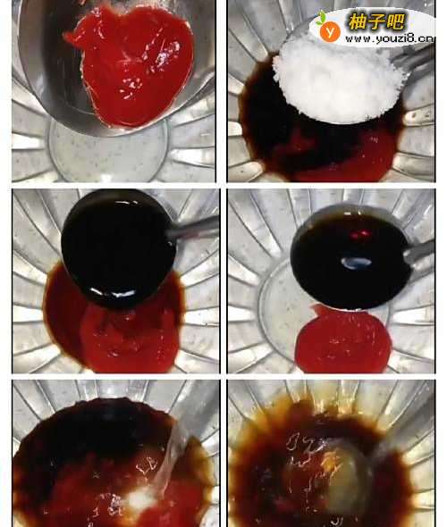 4取一个碗,加番茄酱,生抽,陈醋,白糖,再加一点水,均匀搅拌混合。