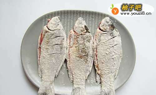 2将鲫鱼先用料酒腌制五分钟,再裹上面粉