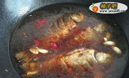 4将煎鱼多出来的油倒出,锅内倒入酱油、生趴注近姜、辣椒、花椒、蒜粒,焖半分钟