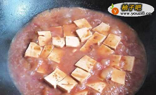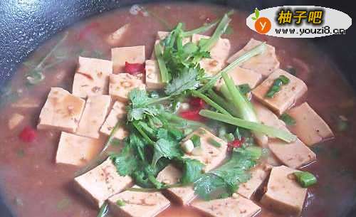 8撒入葱段、香菜,即可关火将豆腐装进鱼盘