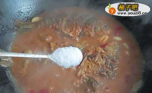6汤汁浓稠的时候放入盐、味精、料酒、葱段熬一分五英钟,将鱼盛出装入盘子里,锅内鱼汤留下
