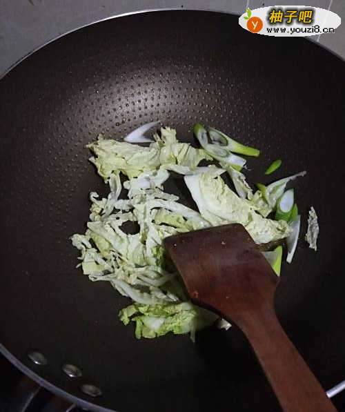 3如图,把切好的大白菜放进锅中翻炒两下。