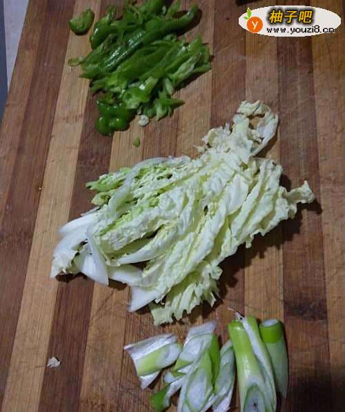2如图,把大白菜、大葱、青椒洗净后切好备用。