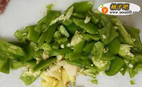 3另外将青椒洗净切段,姜蒜切碎备好。猪肉也切片备好。