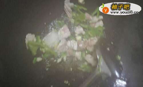 4接下来开始炒菜。将锅底预热,放入猪肉进去翻炒10秒左右,然后加入青椒和姜蒜一起翻炒至10秒左右。