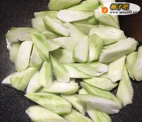 丝瓜去皮洗净切滚刀块,蒜苗切段,蒜头切碎