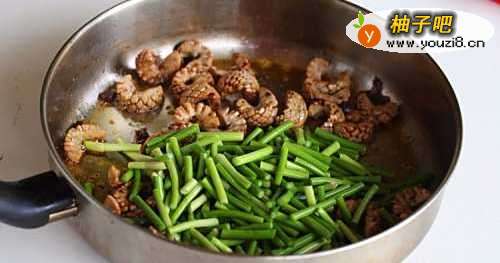10开大火将蒜苔炒熟,再倒入葱姜、酱油、适量盐,翻炒均匀即可出锅