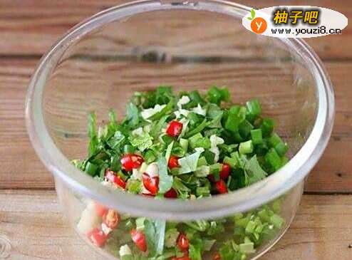 5将香葱,香菜,小米椒,生蒜分别洗净切碎,放入大碗中