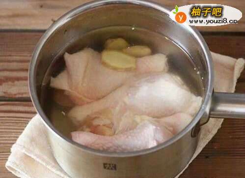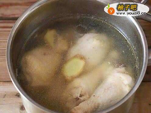将洗净的鸡腿随冷水入锅,放入生姜一块,料酒一勺,大火煮开后转小火继续熬煮