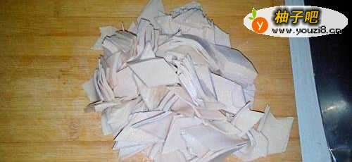 把干豆腐切成菱形块,土豆切成厚片,火腿肠切片