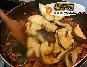 5将准备好的肉沫倒入锅中炒至变色,放入处理过的茄子块翻炒。