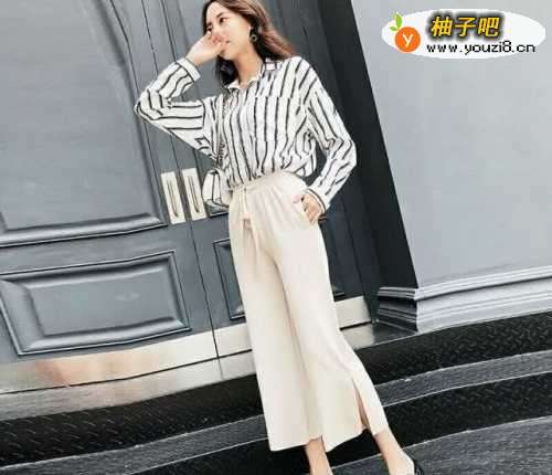 2条纹衬衫搭配九分高腰阔腿裤,小白鞋,非常简约的搭配,却穿出了很高级的欧美风,同时给人眼前一亮的感觉,非常的吸睛。