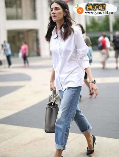 白色衬衫搭配九分款式牛仔破洞裤黑色尖头高跟鞋,非常有个性,同时又很知性,非常经典的搭配,很能够彰显出个人比较高级的穿搭效果。