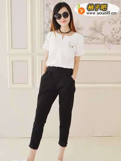 4白色棉麻上衣搭配九分哈伦裤小白鞋,非常常见的搭配,却是有很好的减龄效果,不同的朋友能够穿出不同的味道。