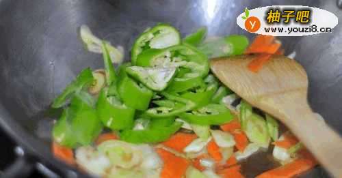 9炒锅热油,倒入葱蒜胡萝卜煸香。加入尖椒。