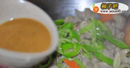 10倒入肥肠煸炒片刻。倒入碗汁翻炒均匀即可。