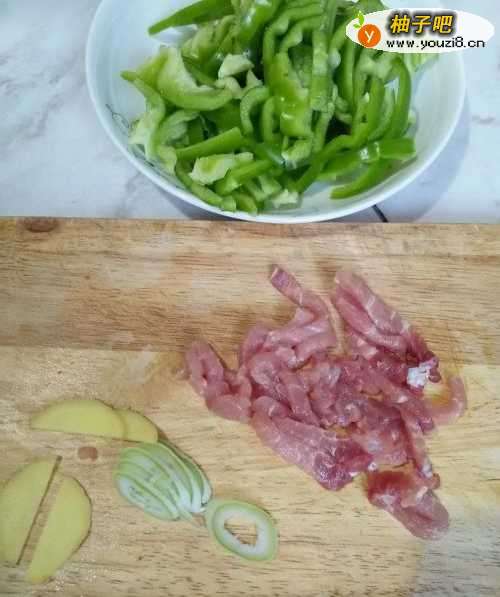 2将甜辣椒去掉根部和里面的籽,切成均匀的细条,将肉切成均匀的丝,将葱和姜切成片。