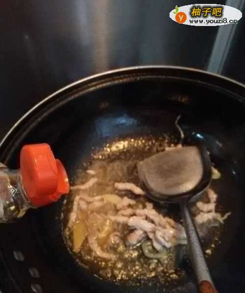 4将肉丝放入锅中,用铲子快速翻炒,这样不会粘在一起。