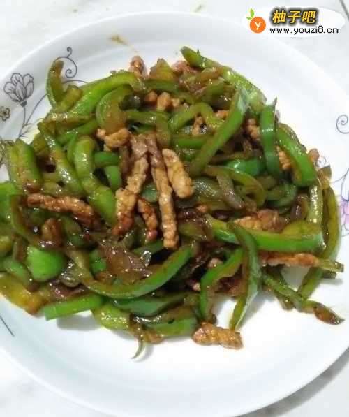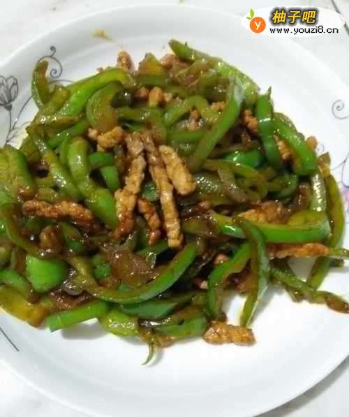 10将肉丝和甜辣椒丝炒熟炒匀,就可以出锅了,颜色翠绿,香味特浓,非常好吃。