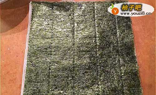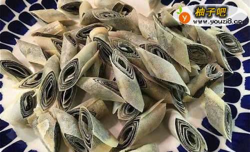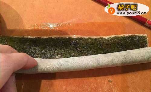 5将全部卷好的紫菜春卷条用剪刀斜剪成小段。