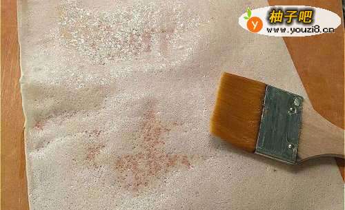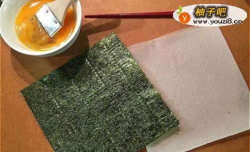 2取一张春卷皮,摊开,在春卷皮的表面抹上少许蛋液。