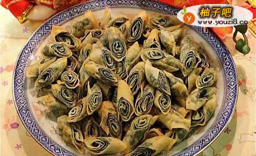 4然后从一边开始卷起来。在收口处抹上少许蛋液,黏实,形成长筒条状。