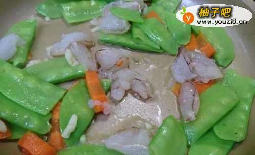 4荷兰豆七分熟时加入蟹肉一起炒