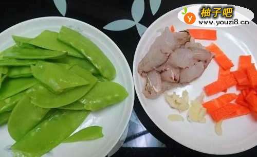 准备食材,胡萝卜切片,荷兰豆切小段