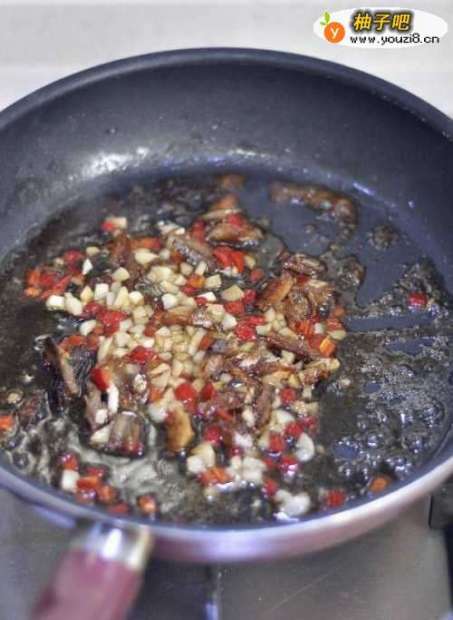 8然后将蒜末、蒸鱼豉油、红椒倒进去炒至汤汁变得浓稠即可