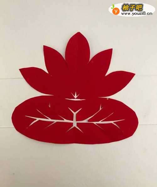 6第六步 剪完外围多余的一部分彩纸之后 再继续剪里面荷花中间的纹缕 还有荷叶上面的纹缕 然后再剪它的修边部分 剪完之后 展开压平就行了