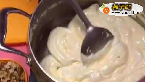 2黄油融化后蚂惹败,倒入棉花糖,不停的搅拌,直到棉花糖全部融化