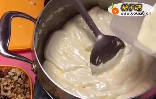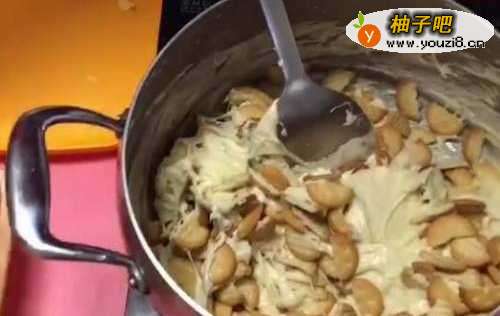 4等奶粉充分融化后,我们倒入酥脆饼干和坚果,充分搅拌