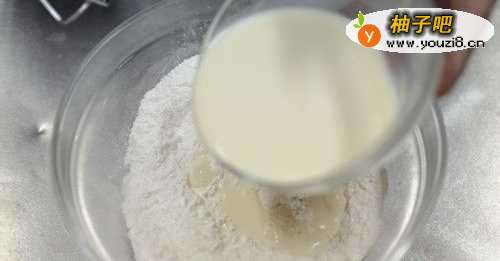 3糯米粉、粟粉混合过筛,加入白糖搅均匀,再加入纯牛奶、色拉油,搅拌均匀,搅拌成粉浆