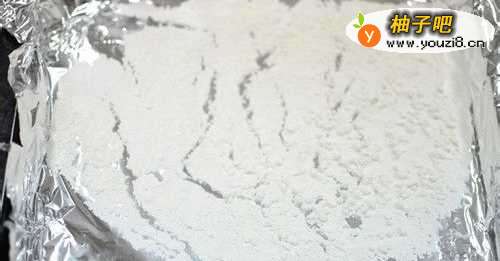 2准备手粉:另取适量的糯米粉放在铺有锡纸的烤盘里,放入烤箱烘烤上下120度烤10分钟左右,取出备用