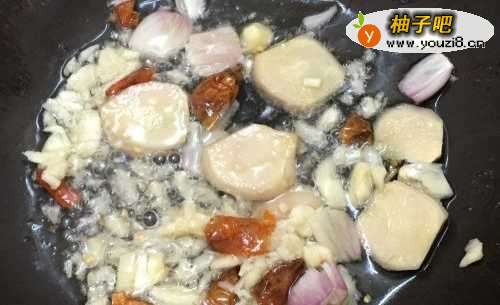 3开始炒,用花生油爆香姜葱蒜和干辣椒。