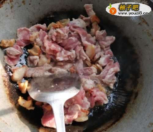 3如图,锅烧热,接着把切好的肥肉片放进锅里炼出猪油。