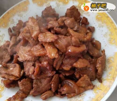 4如图,把肥肉炼制焦黄,这时猪油已经被炼出来了。