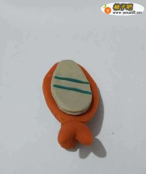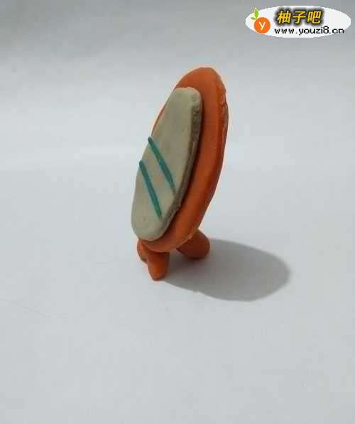 3用白色团一个椭圆形,再按成扁片,粘在桔色椭圆形上面,当作镜子上的玻璃。