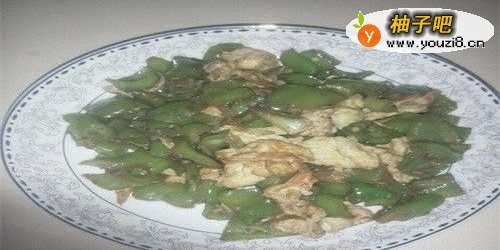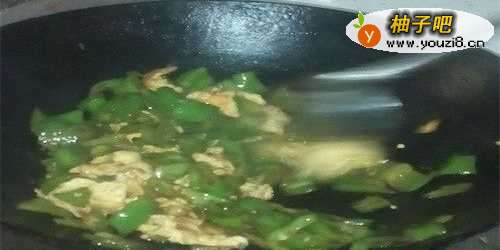 5青椒炒熟后,倒入炒好的鸡蛋,翻炒几下,加入味精,出锅。