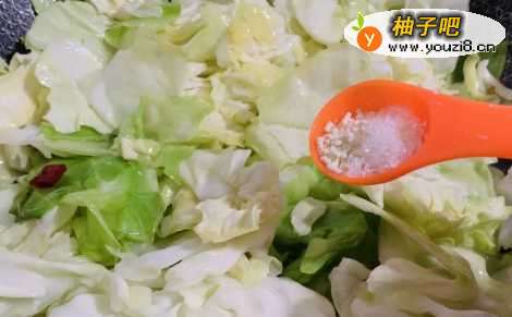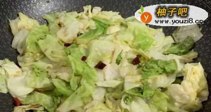 6将圆白菜炒至看着表面有些透亮了,而且在锅里有啪啪的响声就可以了出锅了