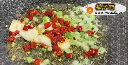 3热锅烧油下入葱花,蒜瓣,干红辣椒小火翻炒出香味,锅里要多放一些油,在炒至辣椒的时候,要用小一点的火将辣椒煎炸出红油,这样炒出来的圆白菜香辣爽口