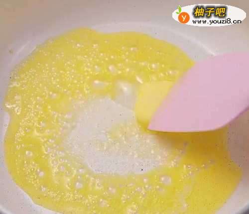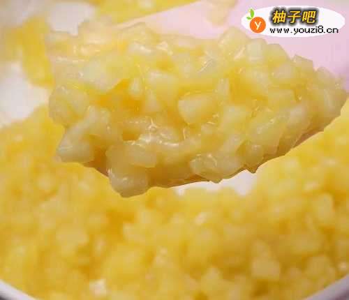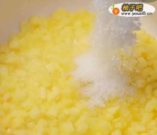 2然后下面苹果丁和适量的白糖进去翻炒。