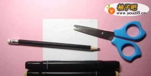 准备好,制作可爱的袋鼠儿童剪纸手工的材料和工具,有白纸、正方形卡纸、马克笔、铅笔,剪刀,如下图所示。