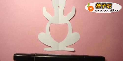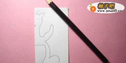 2接着,把正方形卡纸对折一半,并用铅笔在白纸上,画出可爱的袋鼠图形,根据对称图形,这里画出半个图形,如下图所示。