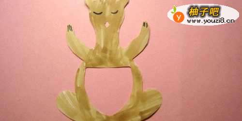 6最后,用浅橙色的马克笔,在剪出的可爱的袋鼠的整体图形上,涂颜色,注意颜色要涂均匀,并用黑色的马克笔在可爱的袋鼠图形上,画出眼睛图形,这样一个可爱的袋鼠剪纸手工就制作好了,如下图所示。