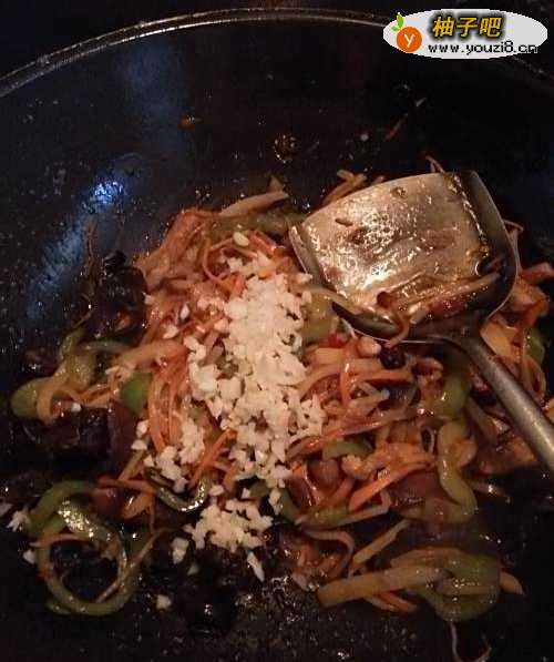 8将香菇条倒入锅中,一起翻炒。