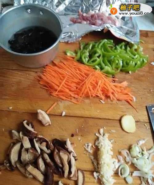 2将土豆、胡萝卜、青椒、肉切成丝,香菇切成条,姜切片,葱切小片,蒜切成末,再用碗兑汁,放入白糖、醋、酱油、料酒、盐,豆瓣酱,白胡椒粉。