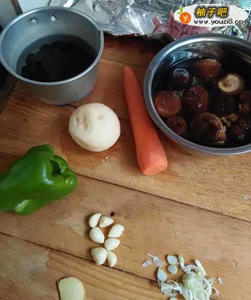 准备土豆、胡萝卜、青椒、香菇、木耳、葱、姜、蒜。