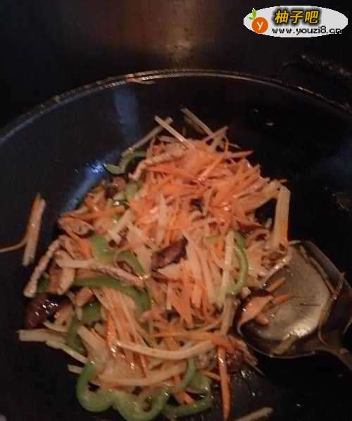 5将胡萝卜丝先放入锅中翻炒。